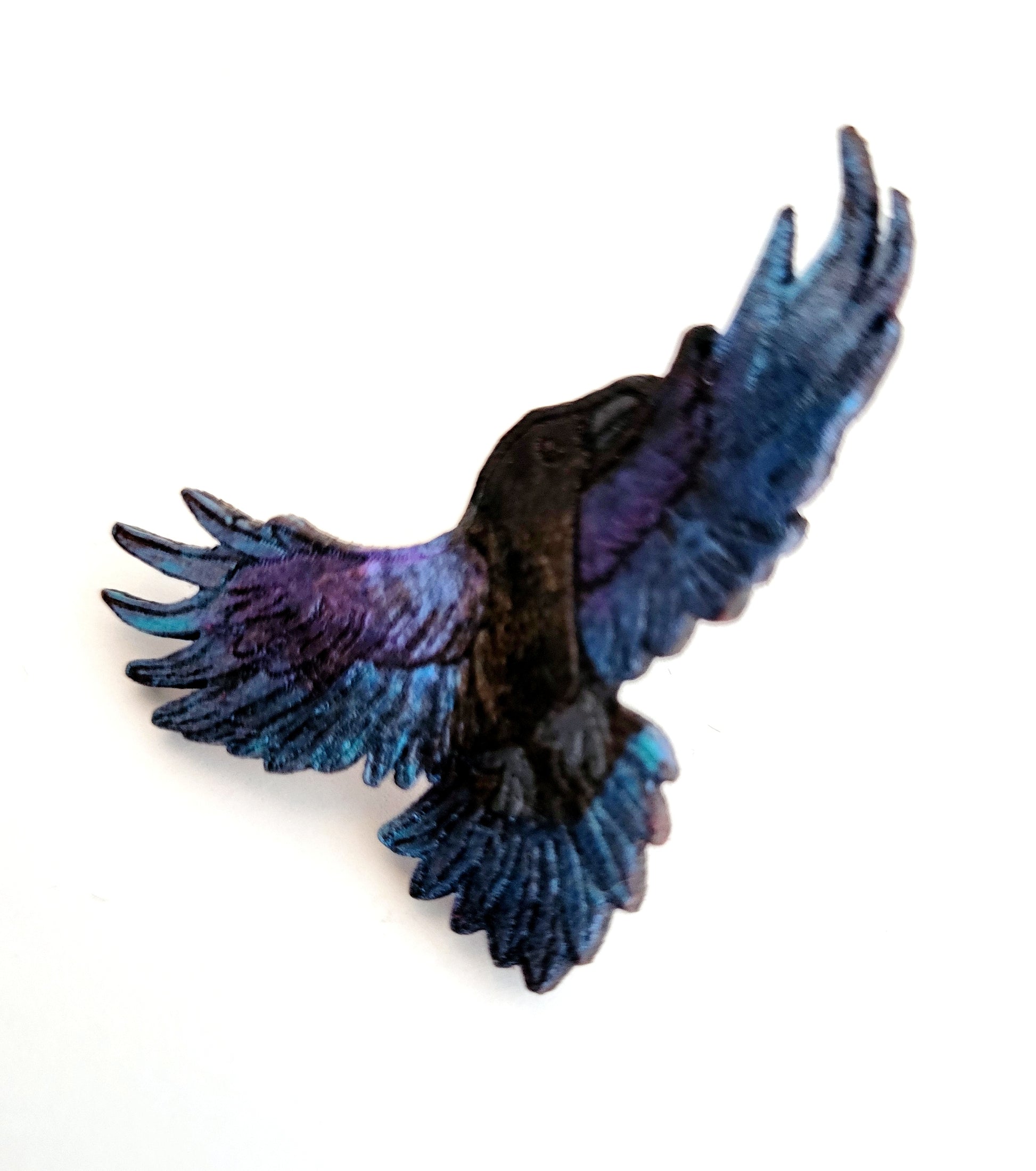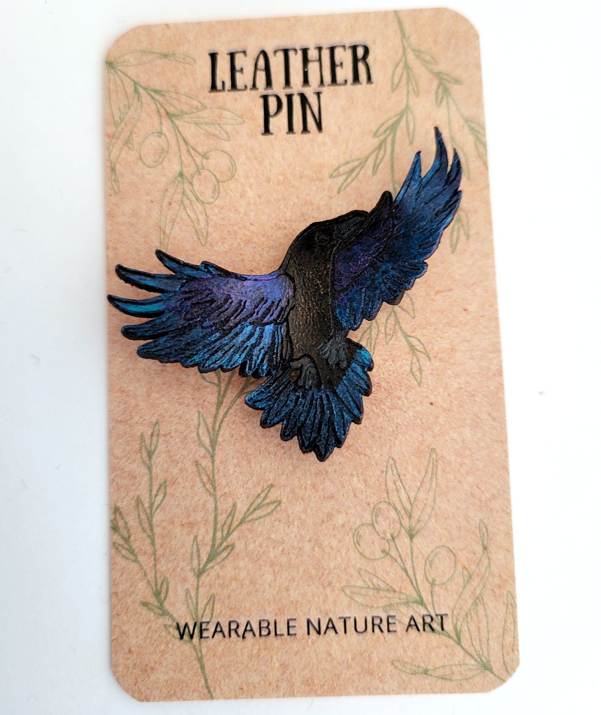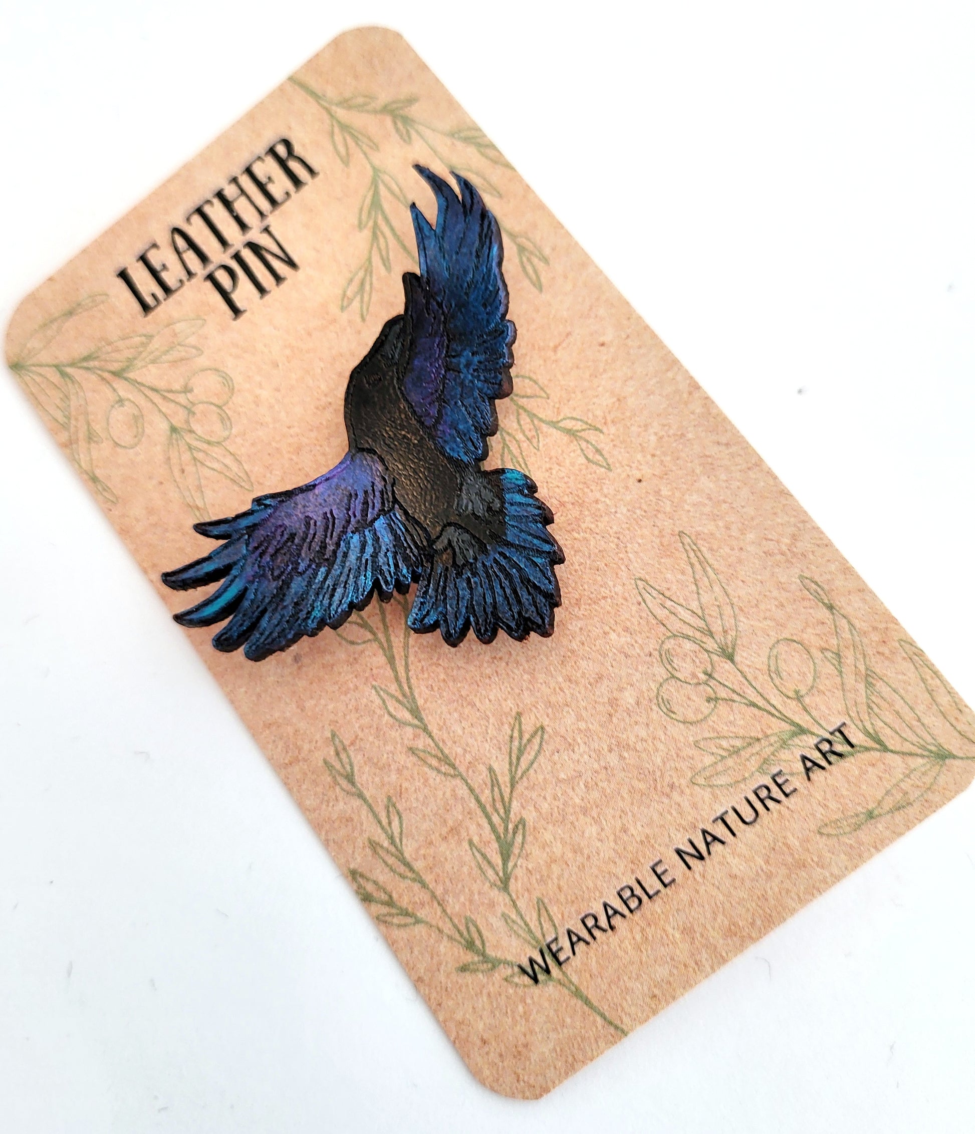 This raven in flight is painted with iridescent blue paint over black to evoke the shimmer of corvid feathers. This leather pin is created from my own original ink drawing, then hand painted.