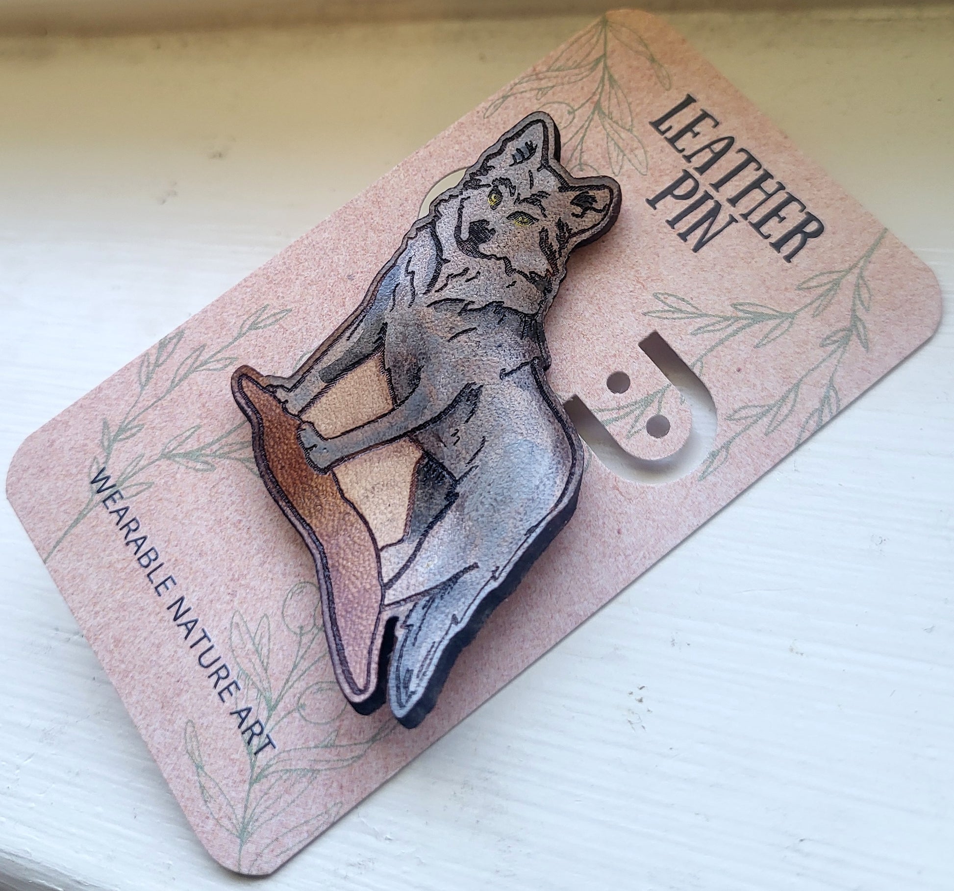 Grey Wolf Leather Nature Art Animal Pin
