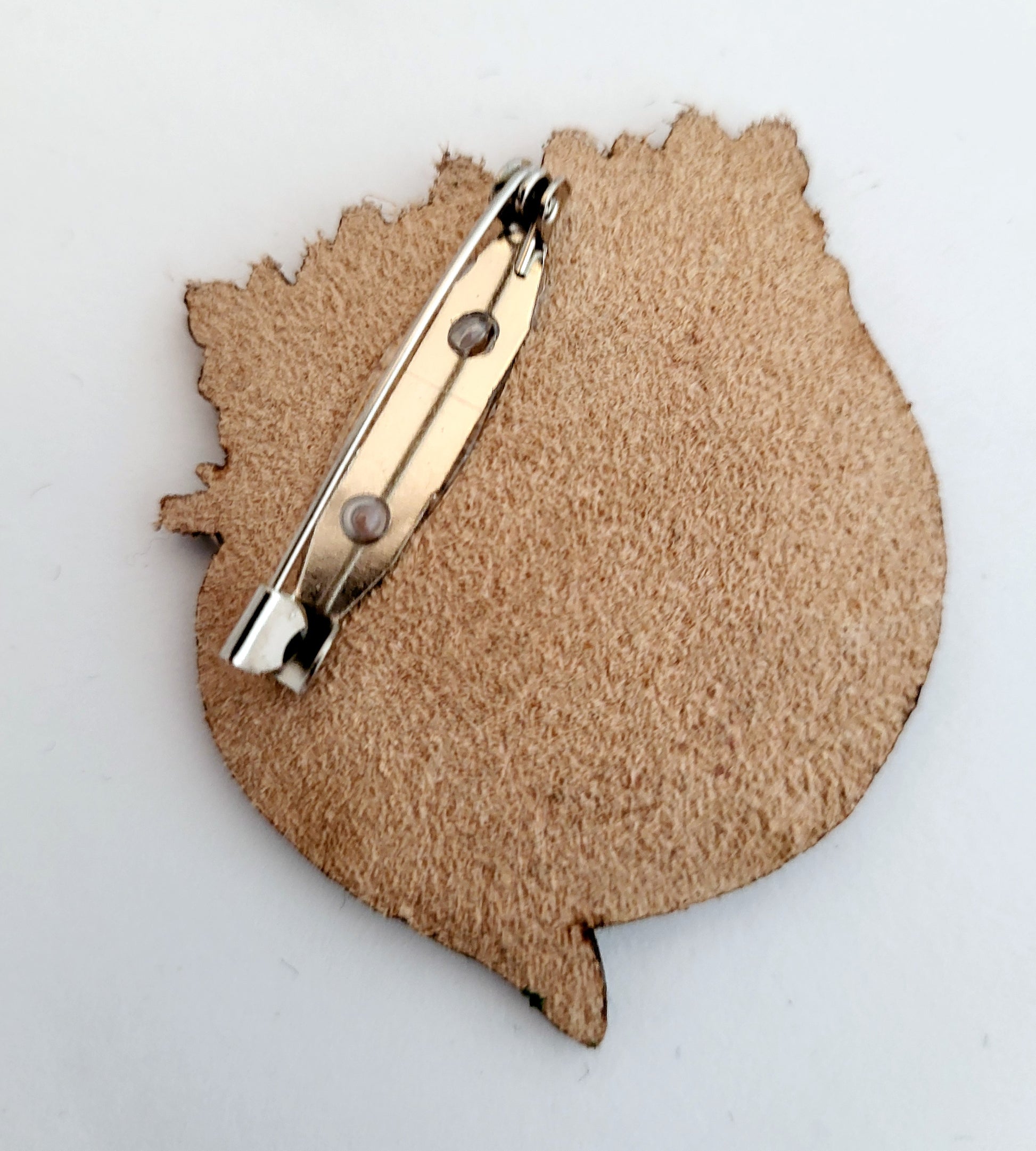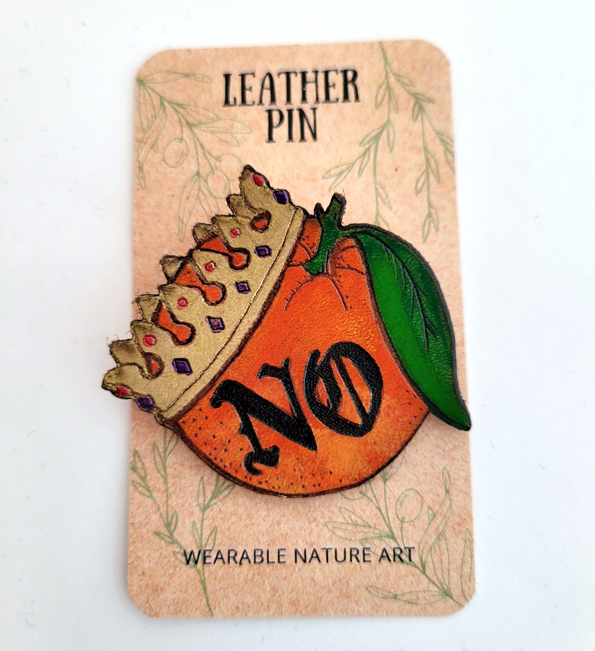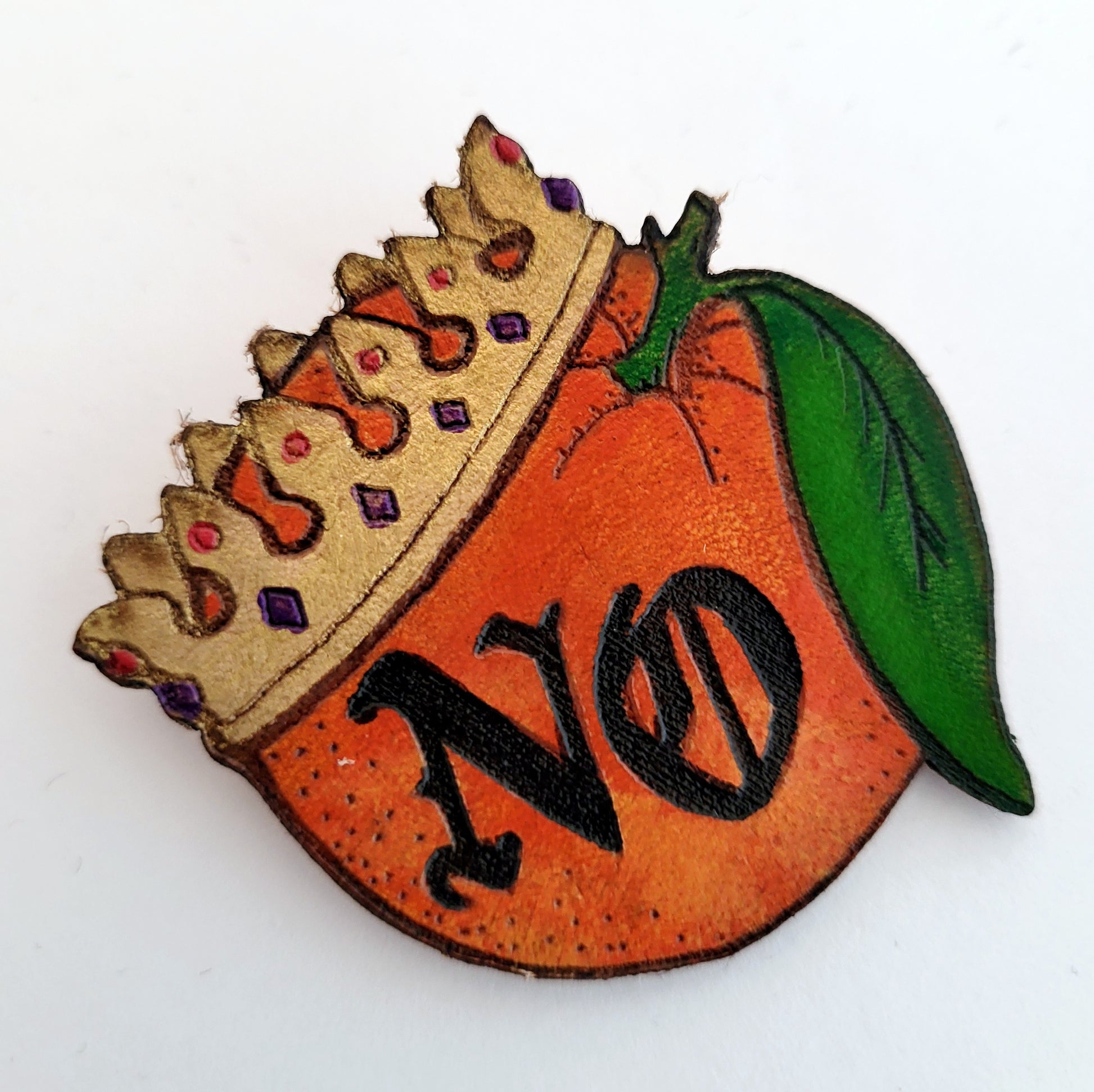I made this protest art so that if I can't make it to a protest I want to attend, the protest can be wherever I am. The pin shows a realistic orange fruit with a metallic gold crown and the bold word "No" in black gothic letters. This leather pin is created from my own original ink drawing, then hand painted.
