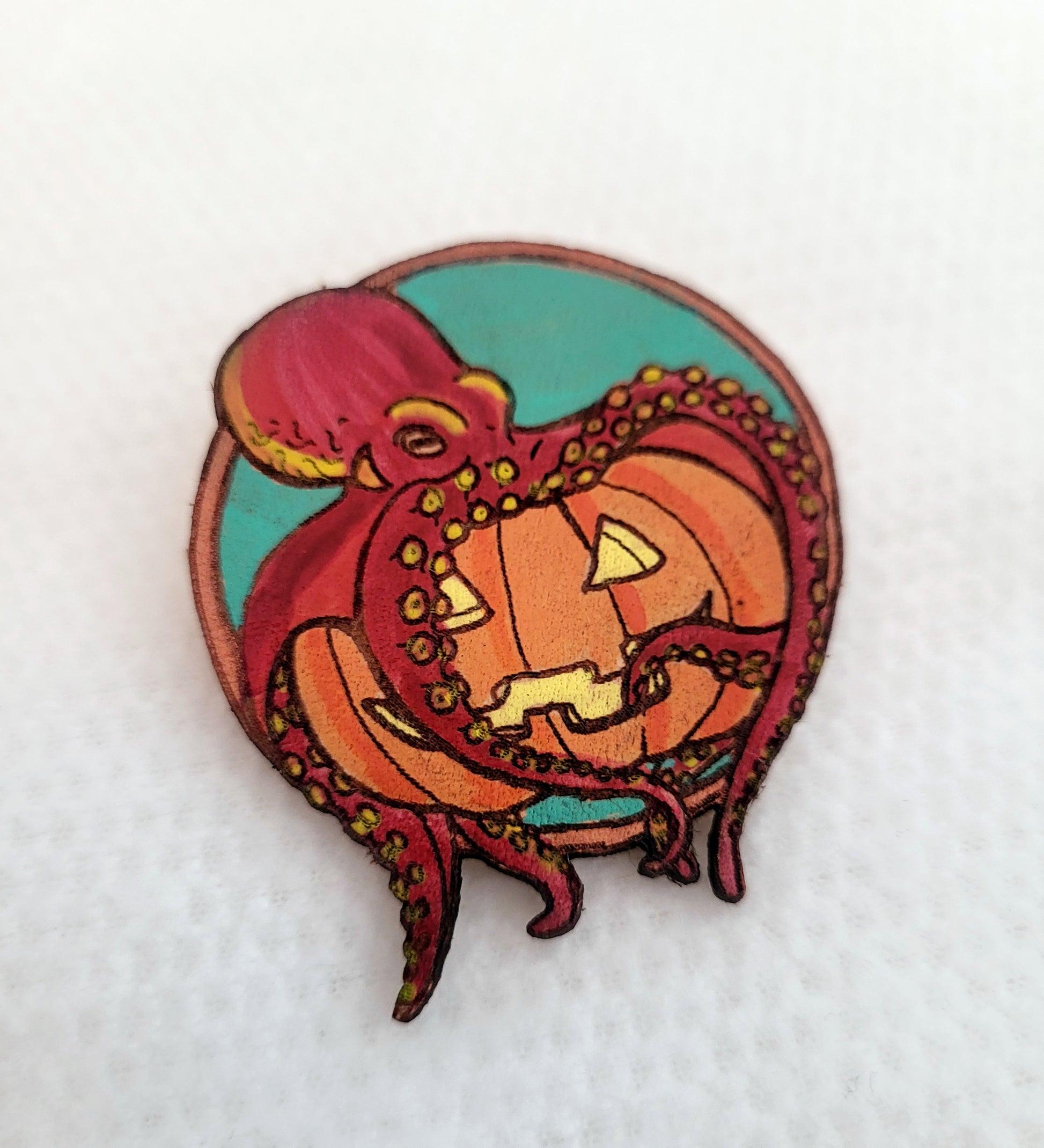This limited edition pin features red octopus curled around a carved pumpkin - festive for the Halloween season! The design has a metallic gold border. The pin comes from my own original art. It is engraved in leather, then individually hand painted.